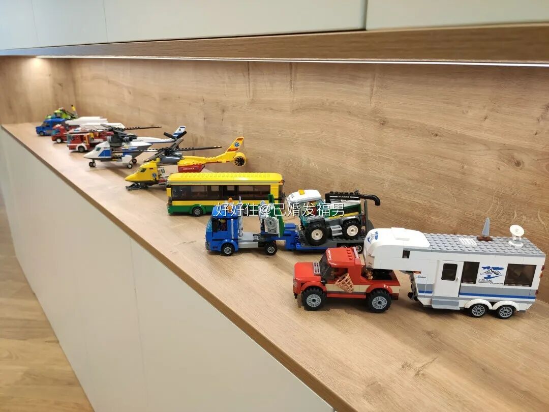 中间嵌入木色框体,还加了灯带,全方位展示屋主收藏的各类乐高。