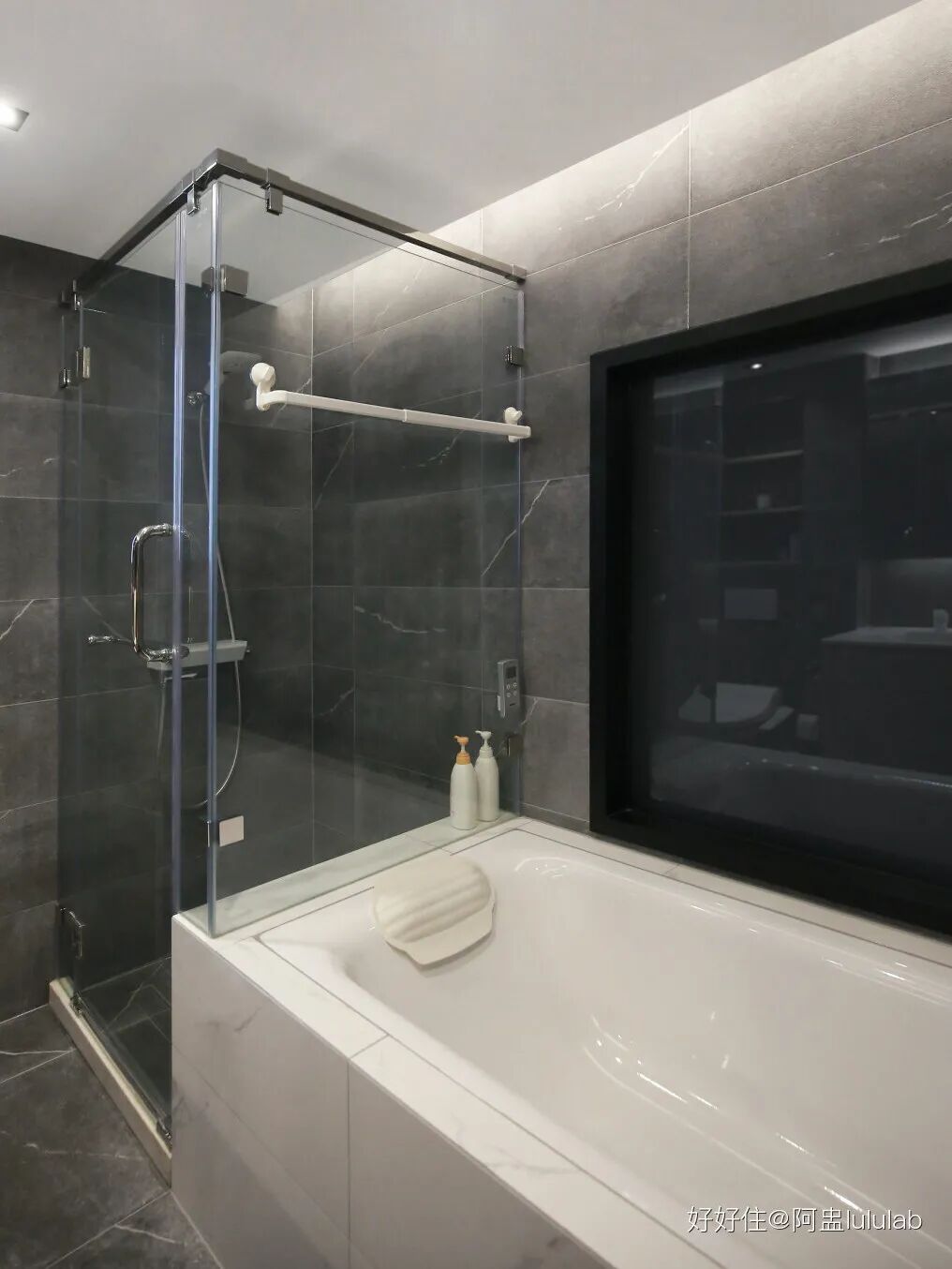 淋浴与浴缸结合,清洁完身子好泡澡。浴缸台子向里多砌出一部分给淋浴间,用来放沐浴用品。