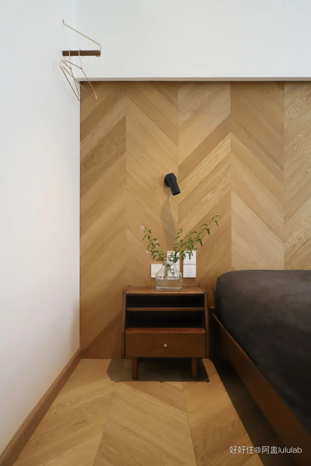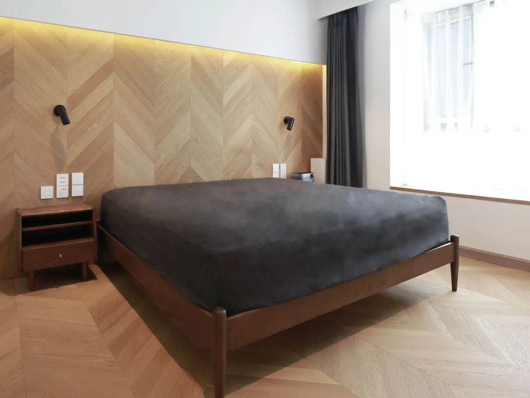 为了营造一个能真正放松的休息环境,卧室没有多余繁复的设计。取消传统床头,鱼骨拼地板沿床头方向一直向上延伸。