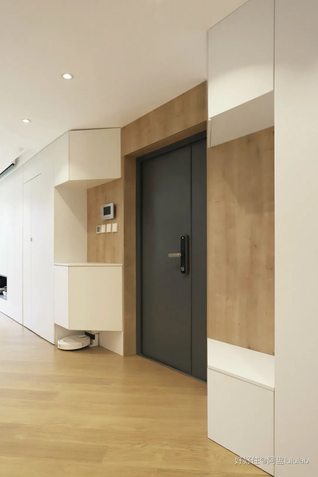 左侧斜切地柜充当换鞋凳,墙面增加挂钩可以挂外出衣帽包包等。右侧柜子高度刚好能随手放置进出门小物,底下悬空给扫地机器人安家。