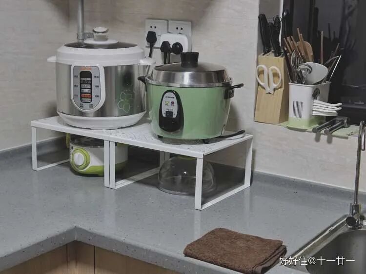 两个瓦瑞拉搁板分别把高压锅和电饭锅架高,底下放蒸蛋器,要用的时候拉出来即可。为了给小厨房挤空间也是操碎了心…