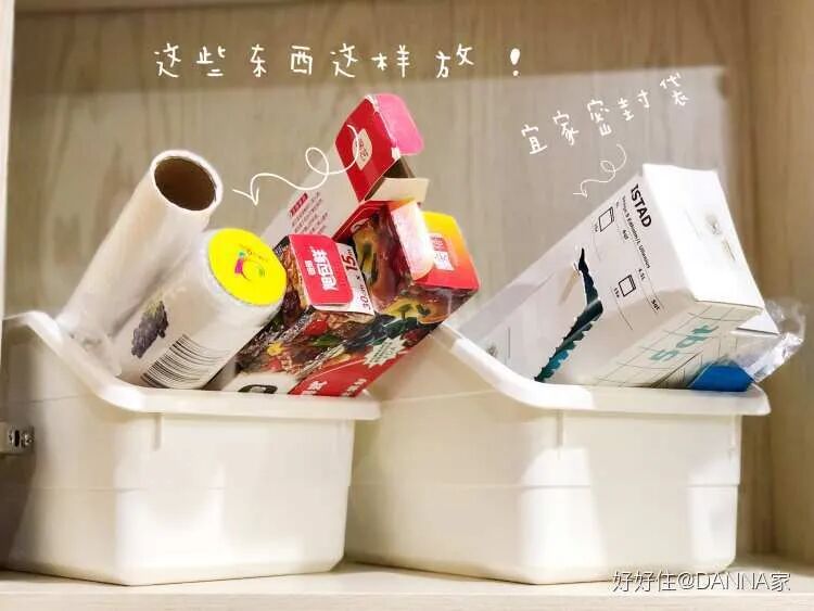 用宜家索克比盒子来放 一筒筒的保鲜膜 、保鲜袋 、锡纸 、烘培纸等等,比起平放在吊柜上这样取下真的方便很多,盒子是一高一低的,可以放下好几个了。