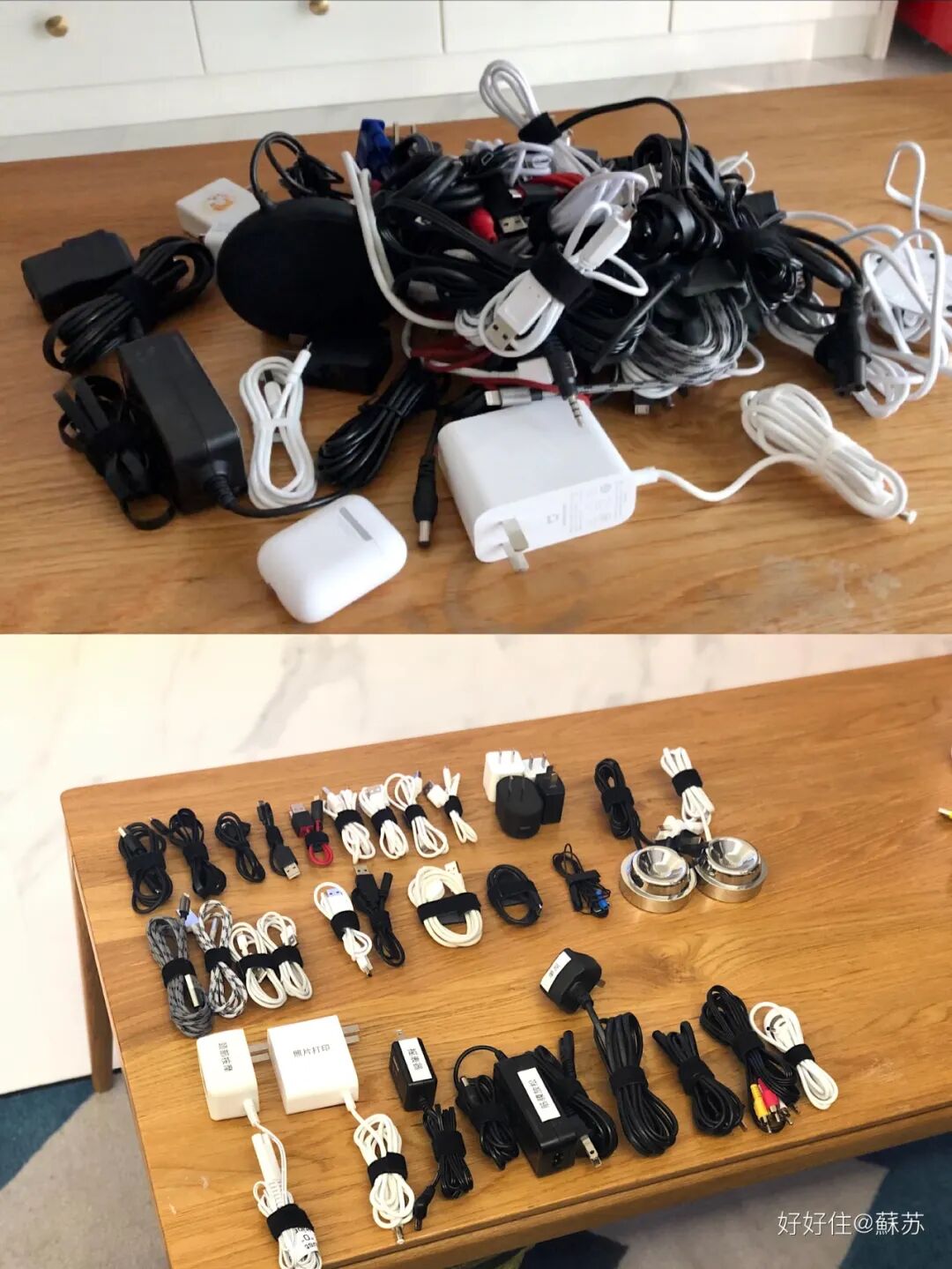 同接口的数据线合并同类项,连数据线的插头也别攒着十好几个了。还有那些压根不会再用、完全不记得是干嘛的电线,扔扔扔!