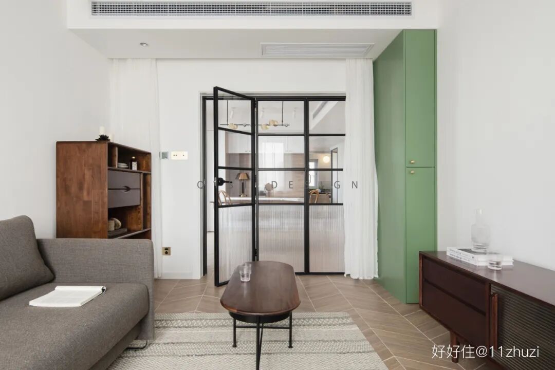 两个房间的隔墙被拆掉,替换成玻璃折叠门,不阻碍光线的流动,让整个空间通透而明亮。折叠门敞开时,两个空间合二为一,折叠门关闭后,搭配纱帘,南侧的房间又可以暂时恢复私密空间,成为临时的客房,十分灵活。玻璃折叠门两侧的空间,功能上却各有侧重,一侧偏向工作,另一侧偏向休息。工作室内,沿着墙面定制了「柜体+办公台面」的墙面办公桌,满足了日常在家办公的需求。工作桌的对面则是颇为壮观的 CD 收藏区,两个定制的松木原木顶天立地柜承载了超过 1500 张 CD。另一侧的房间更多是满足休息娱乐的影音室,整体颜色以大地色为主,家具也都选择了比较轻巧的款式,方便移动,从而方便整个空间的功能变化——可以是影音室,也可以成为客房。这个空间里,既有传统的沙发正对电视柜的格局,也在窗户的一侧藏了一整块投影幕布,选择哪种观看方式全凭当下的喜好。阳台是工作室的延伸。家里的橘猫,蛋蛋,陪伴了屋主多年,也是重要的家庭成员。于是,在阳台的一角,专门设计了专属于它的游乐场,包括猫爬架与猫窝。另一侧,装了一个折叠跑步机,由此,阳台也是运动角。不需要运动的时候,跑步机折起来,宜家的波昂躺椅满足闲暇晒太阳的需求。改造前,走廊狭窄黑暗,完全是由实体墙隔出的。改造后,拆掉了墙,筑起了一道弧形玻璃隔断,一改之前的狭窄闭塞,让空间通透、明亮且过渡流畅,还顺势引导了路径。玻璃幕墙后是卫生间,右边是衣帽间。走廊的天花板下同样一以贯之地藏着些许「弧线」细节。卫生间就被围合在这个毛玻璃弧形墙内,透光却不透视,让老房子里的不见光暗卫从此再不会「又黑又脏又逼仄」了。客卫同样是「绿+白」的搭配,格局上,一侧花洒淋雨,另一侧是特殊尺寸的坐式浴缸,墙上设计了几道壁龛来满足卫生间收纳。卫生间的另一侧则是兼具储藏室功能的衣帽间,衣帽间的隔墙同样被打开了,做了大玻璃门,又再次为走廊补充了光线。设计师将房子公共空间的东侧部分划入了主卧,打造出一个功能齐全的主卧大套房,以一道门作为区隔,区分出公共区域与私密区域。整个卧室区域包含阳台、卧室、衣帽间、洗衣区、卫生间,由南向北层层递进,舒适度与便利度直线上升。设计中,通过层层叠叠的弧形门洞,划分出不同功能区域,同时也打破了单调乏味的过道体验,让空间的层次感更为丰富。卧室阳台朝南,采光极佳。通过绿色半墙、藤编家具、人字拼地板等等元素,完全实现了屋主预想中「越南法式」的感觉,柔和放松,又不乏复古与端庄。一侧的床头还包括化妆区,墙壁内嵌入壁龛,成为化妆桌的补充。