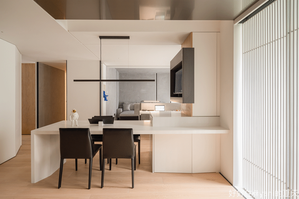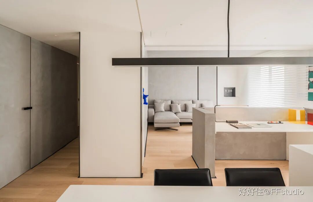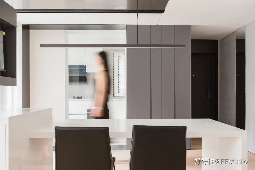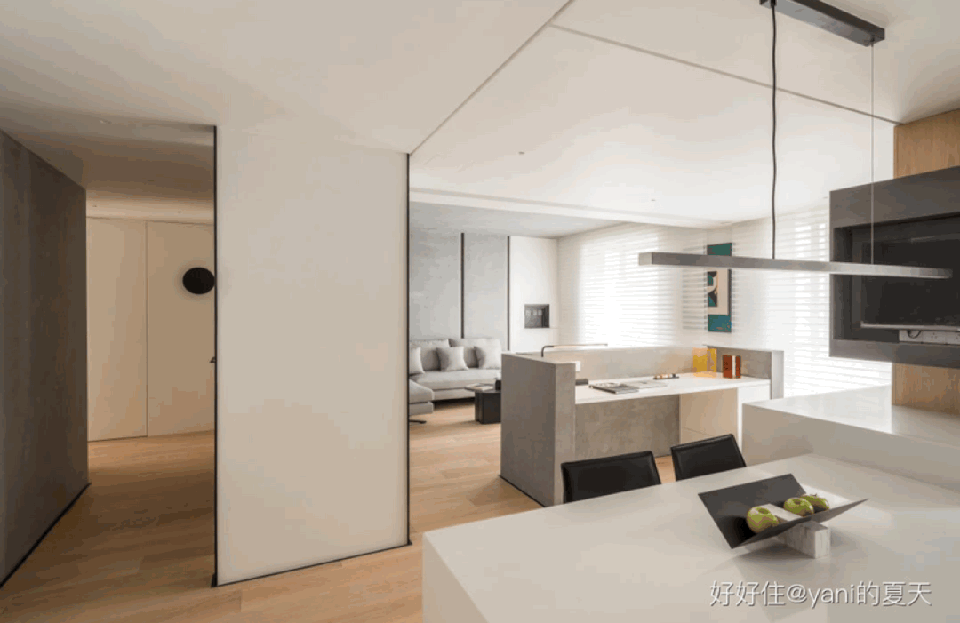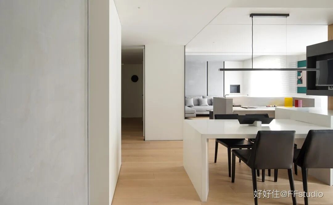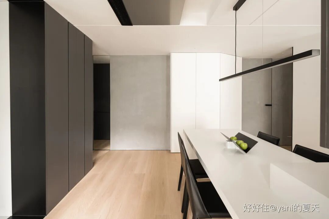 从北阳台看向餐厅,左面是转角黑色鞋柜,餐桌尽头处切斜角的白柜作为杂物收纳,白色柜子浮在灰色墙上,并不会感觉突兀。