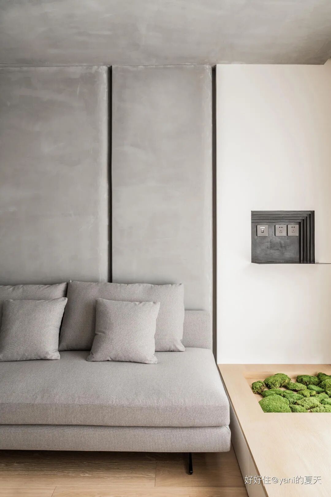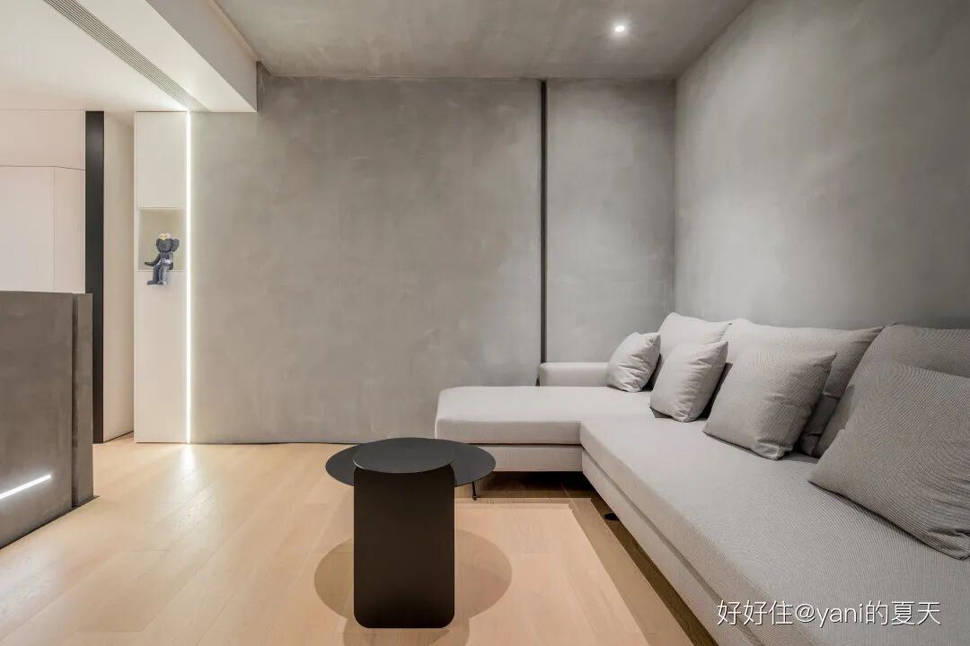 沙发背景墙也不是简单的抽缝,而是两块墙体拼接,中间的边缘做了弧形角。这样的留缝和切割比普通平面更有趣,也更精致。