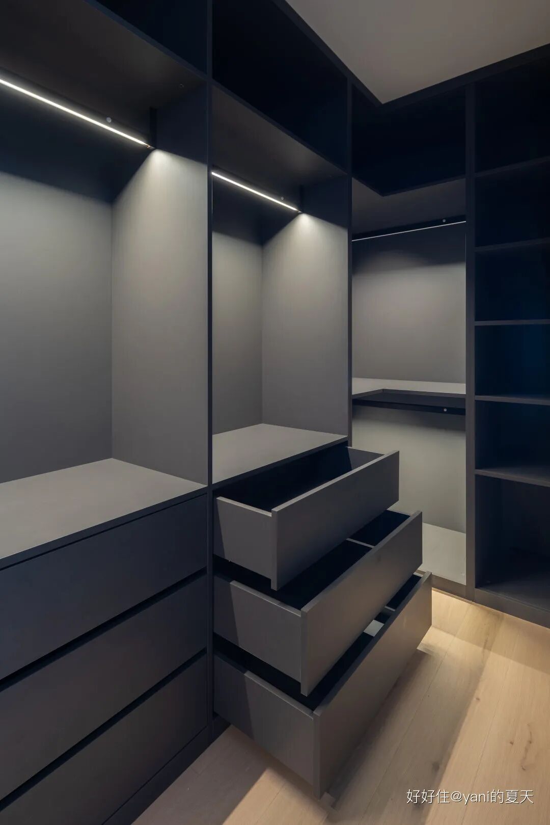 衣帽间依然是纯灰色柜体,内部和底部都装了灯带,方便拿取。