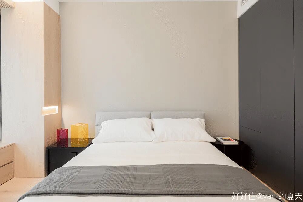因为挪过卧室的墙,所以床头有根梁柱。设计师在顶面做了一个斜坡,看起来会和谐很多,并不会显得太突兀。