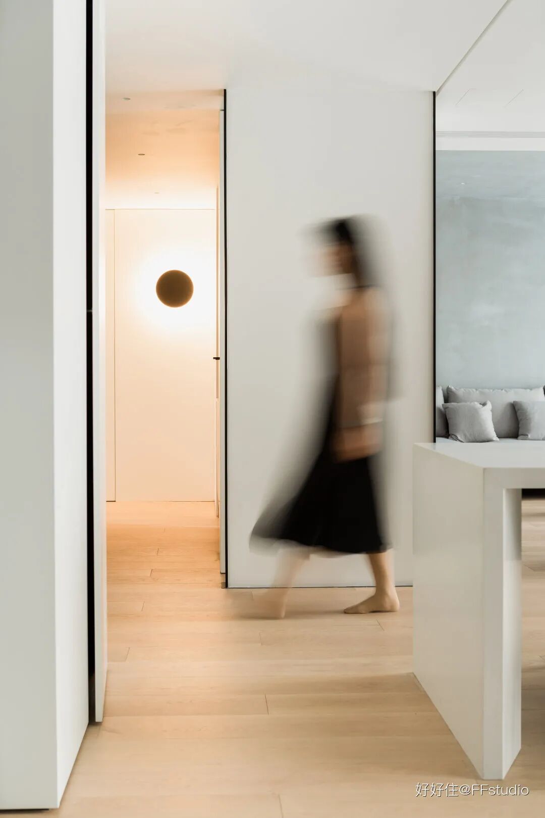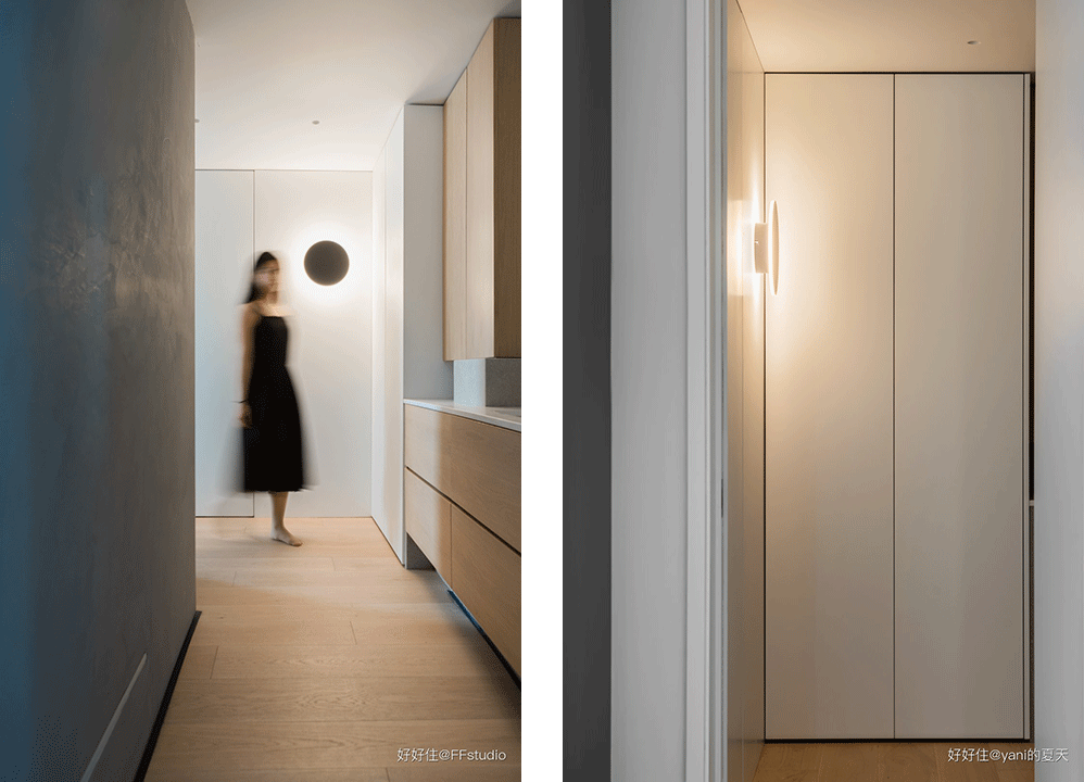 玄关底端,也就是走廊尽头,用了一个很简单的圆形壁灯来指引方向。像傍晚的落日,散发着余辉,回到家很有归属感。