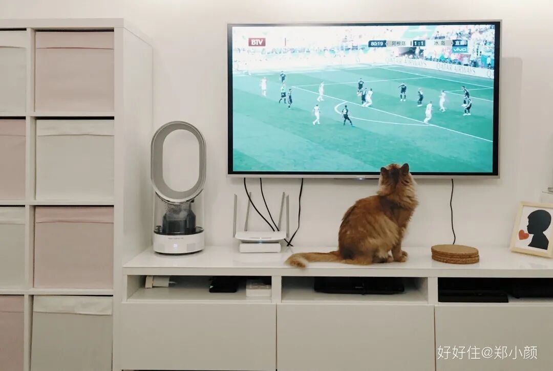 电视柜分为三组,左边卡莱克搁架完成日常储物的收纳功能,空出的小格子可以给猫咪做窝。