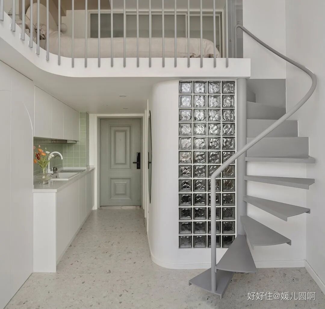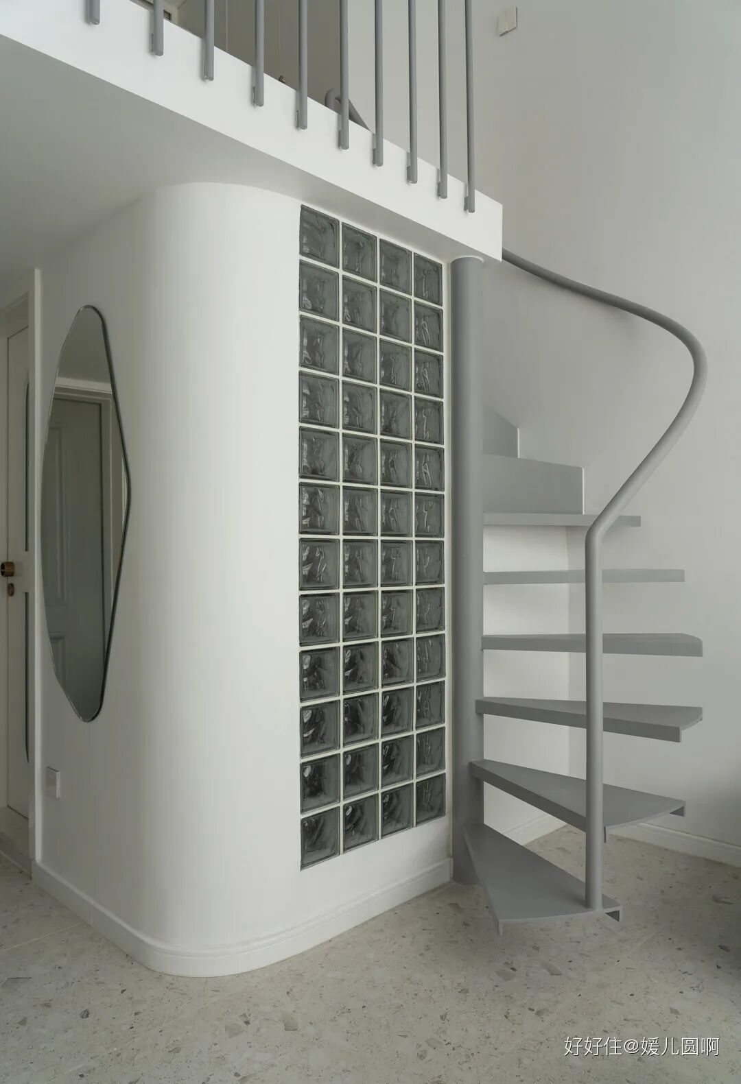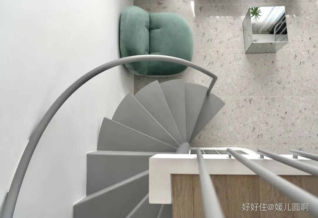 楼梯对于 loft 来说,实在是无法忽视的存在。屋主花 2 万元,打造了这个磨砂灰色旋转楼梯,与二楼的栏杆相接,线条流畅、存在感强。