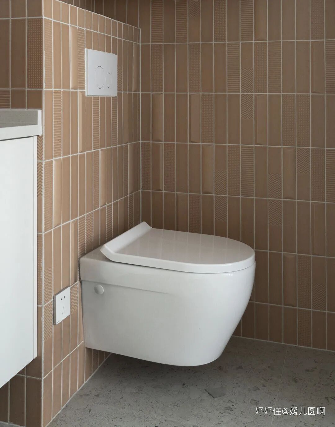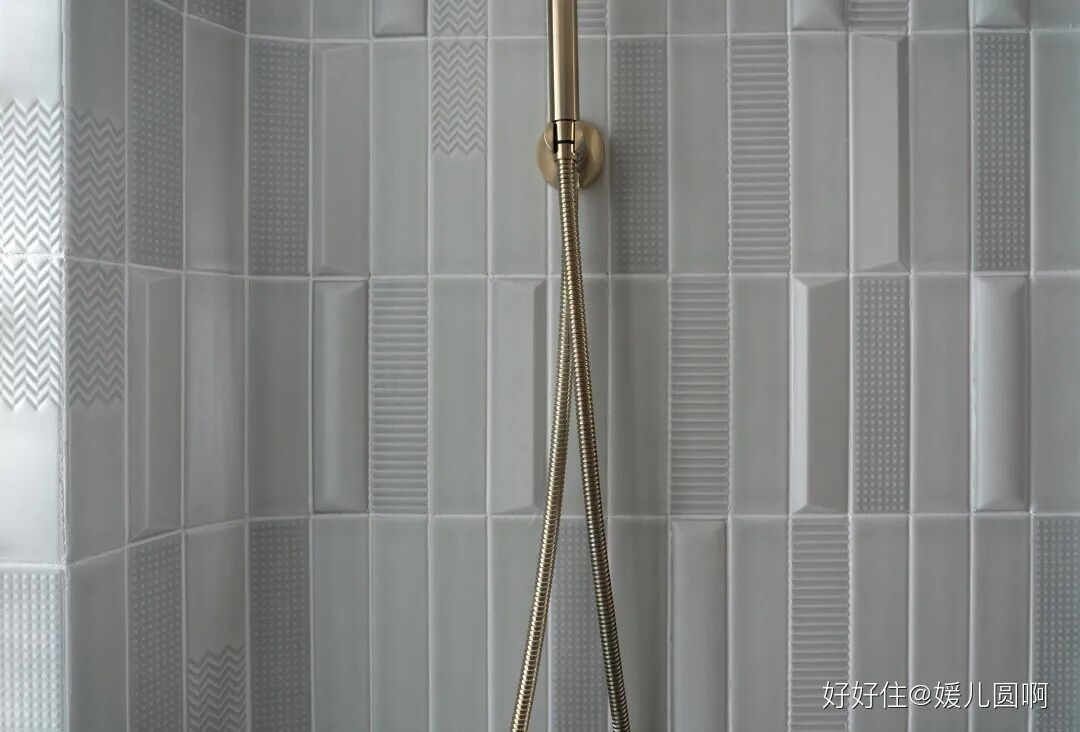 再看看卫生间的「小饼干」墙砖,哑光面、糖果色,不同程度的凹凸,显得错落有致,真是藏满了小心思。