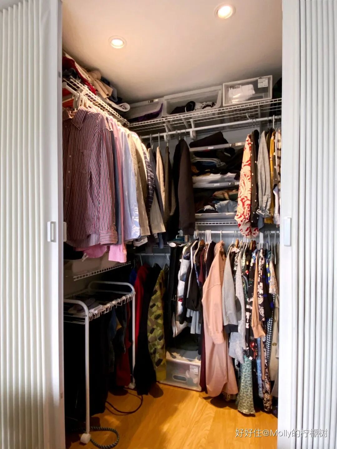 床的另一侧,是小衣帽间。由于面积小,选择了阁室美。Molly 建议,如果空间宽敞,还是建议选择配件更多的宜家。