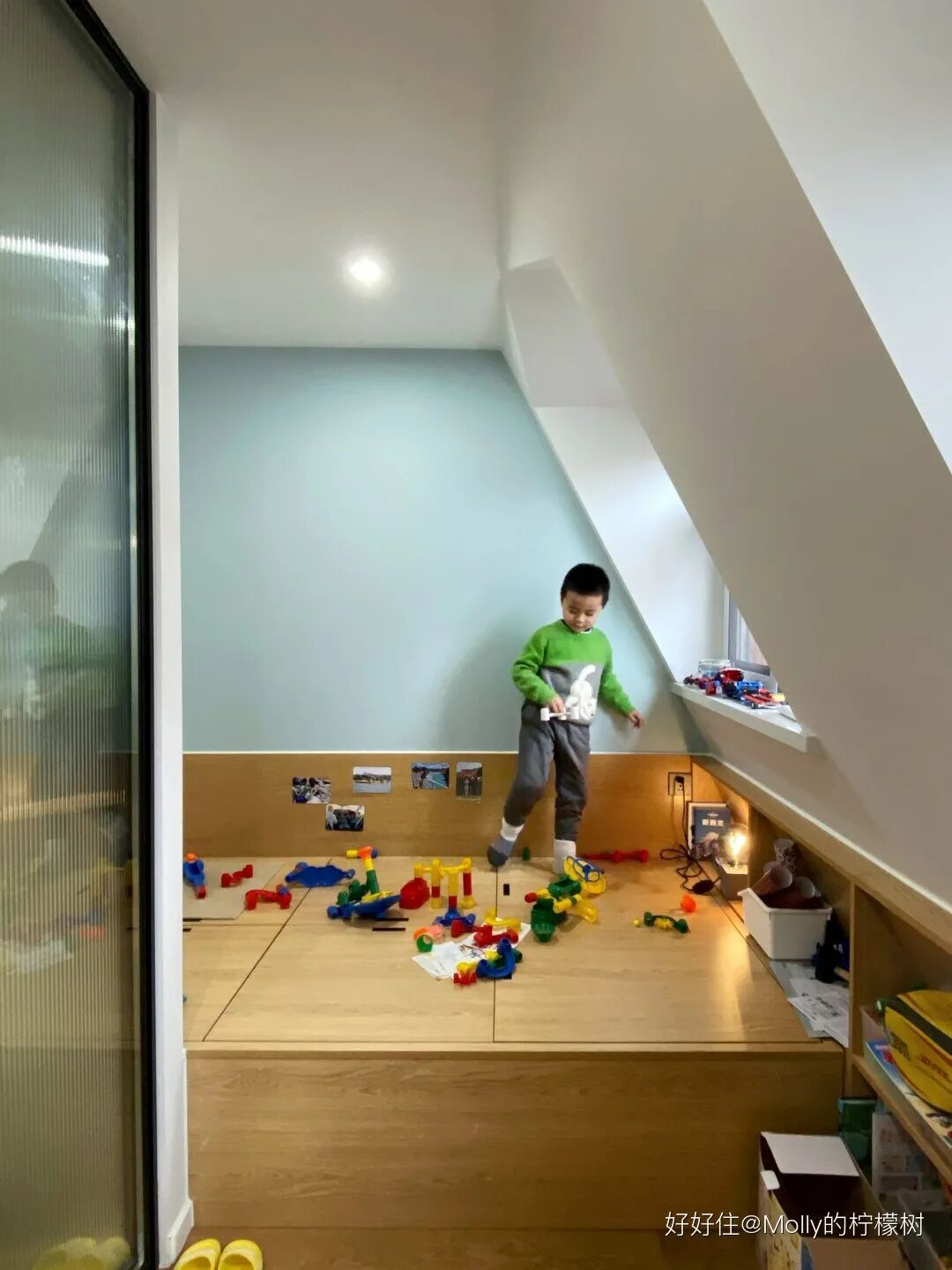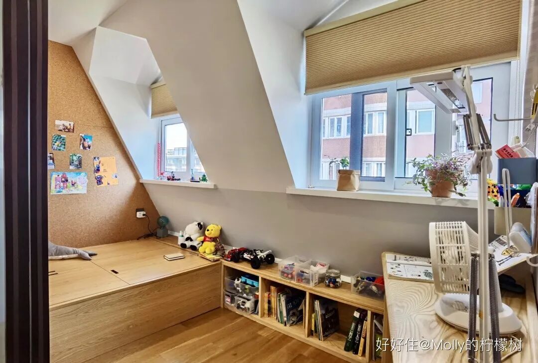 因为儿童房很小,又是斜线型,看似小小的改造其实也花了不少力气。