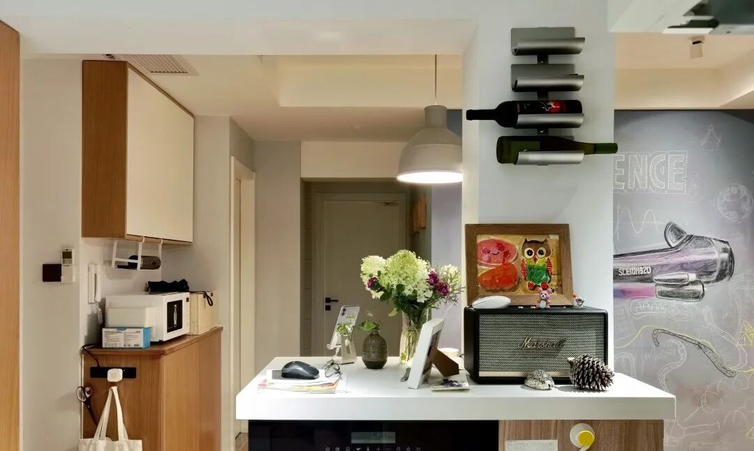 迷你中岛集合了蒸烤箱和收纳柜,柜子上做了酒架,当然要配上音响。从这个视角可以看到,「洄游空间」的设置更显开阔。