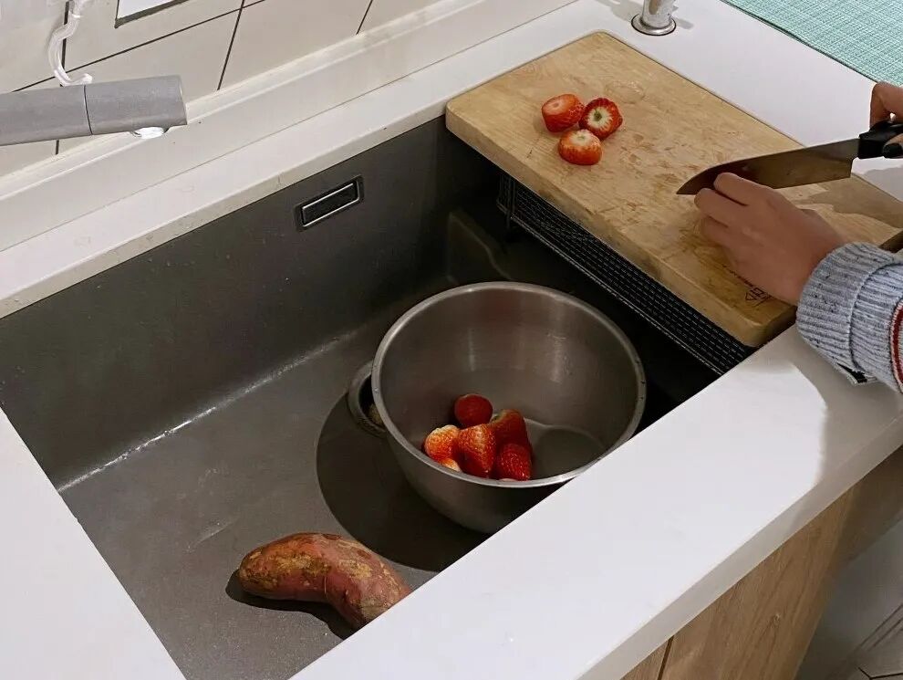 大单槽是 Molly 从欧洲海淘的 Blanco,为此还专门淘了一块桧木砧板放在上面,切完的残渣可平移到水槽,再通过垃圾处理器处理,简直完美。