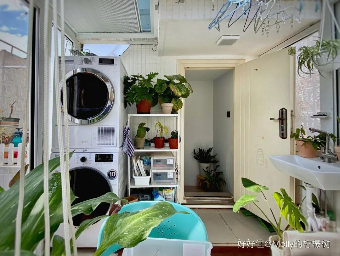 Molly 巧用露台入口的小空间放置了洗烘套装,到了深秋,也可以把不耐寒的植物搬到这里,保证温度。