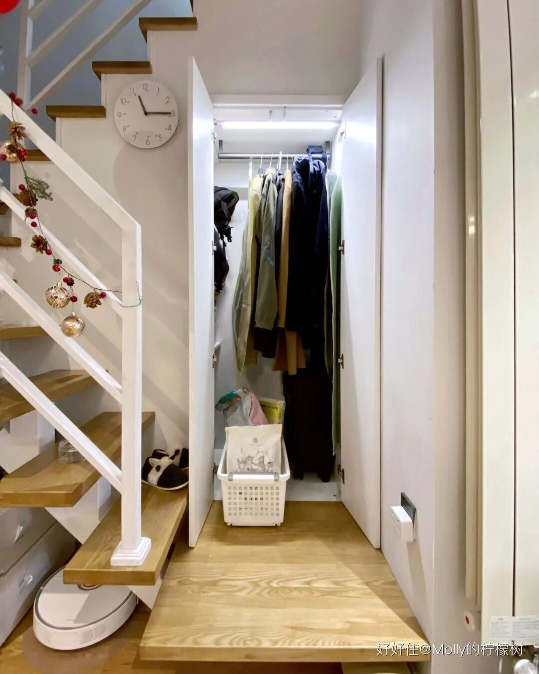 楼梯下面设计了一组抽屉柜和衣帽壁橱,主要用于解决秋冬的大衣外套。壁橱左侧,存放不常使用的包和配件。楼梯底部的空间,让扫地机器人有处安家。
