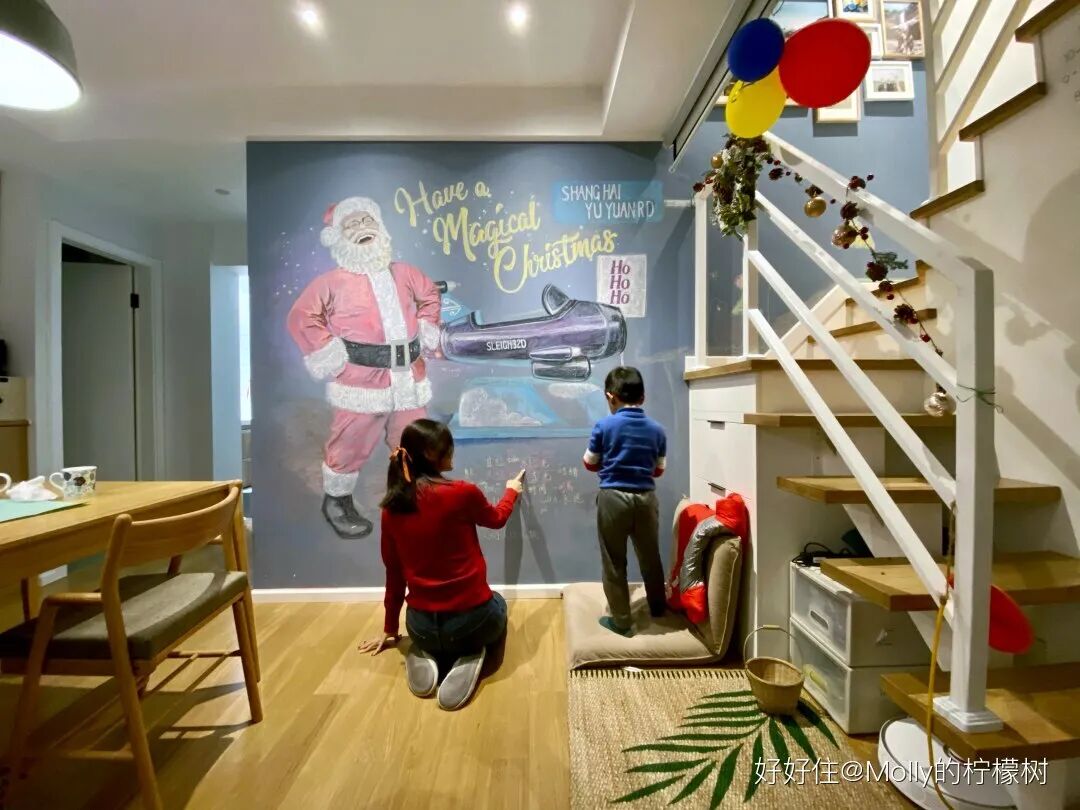 旁边这面巨大的黑板墙,用来涂鸦。Molly 高中学过绘画,画黑板报还是得心应手。