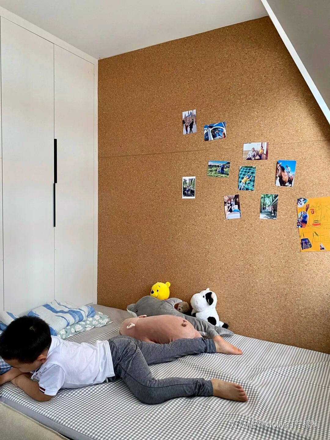 把乳胶漆改成软木墙,可以贴上孩子的画作和照片,尽情让他随意发挥想象。