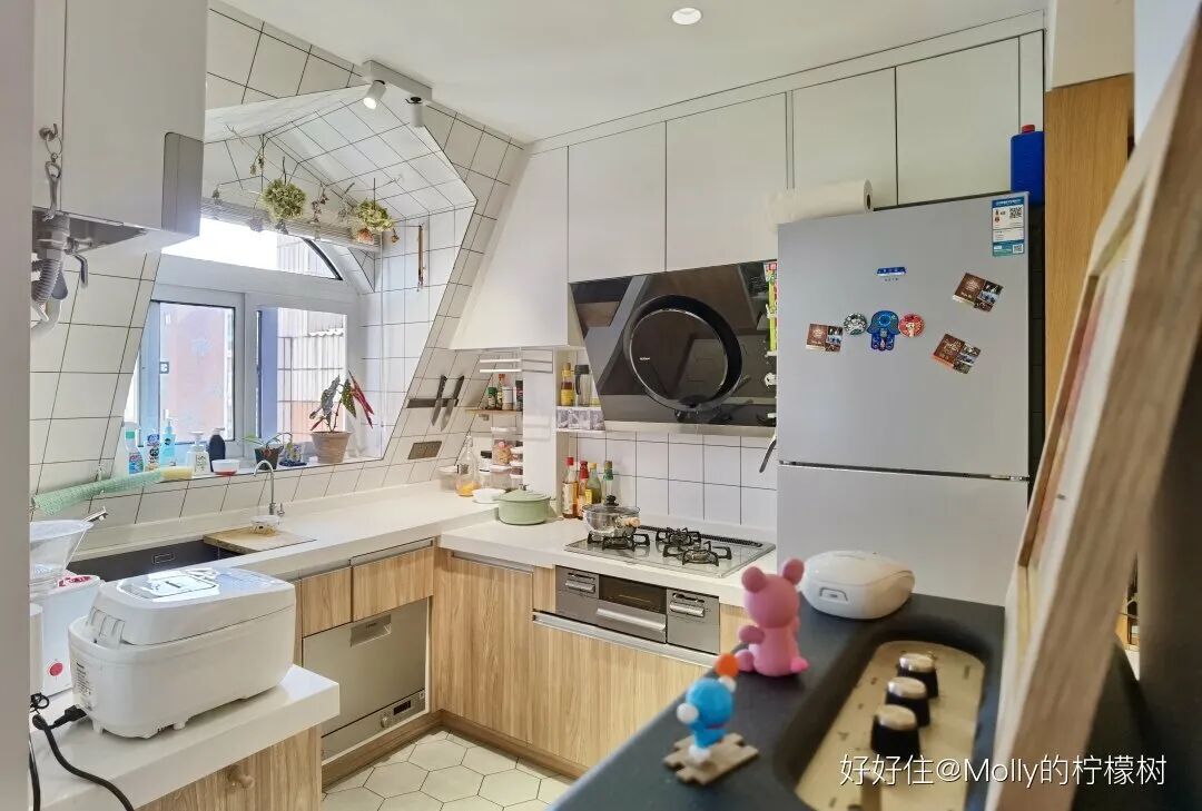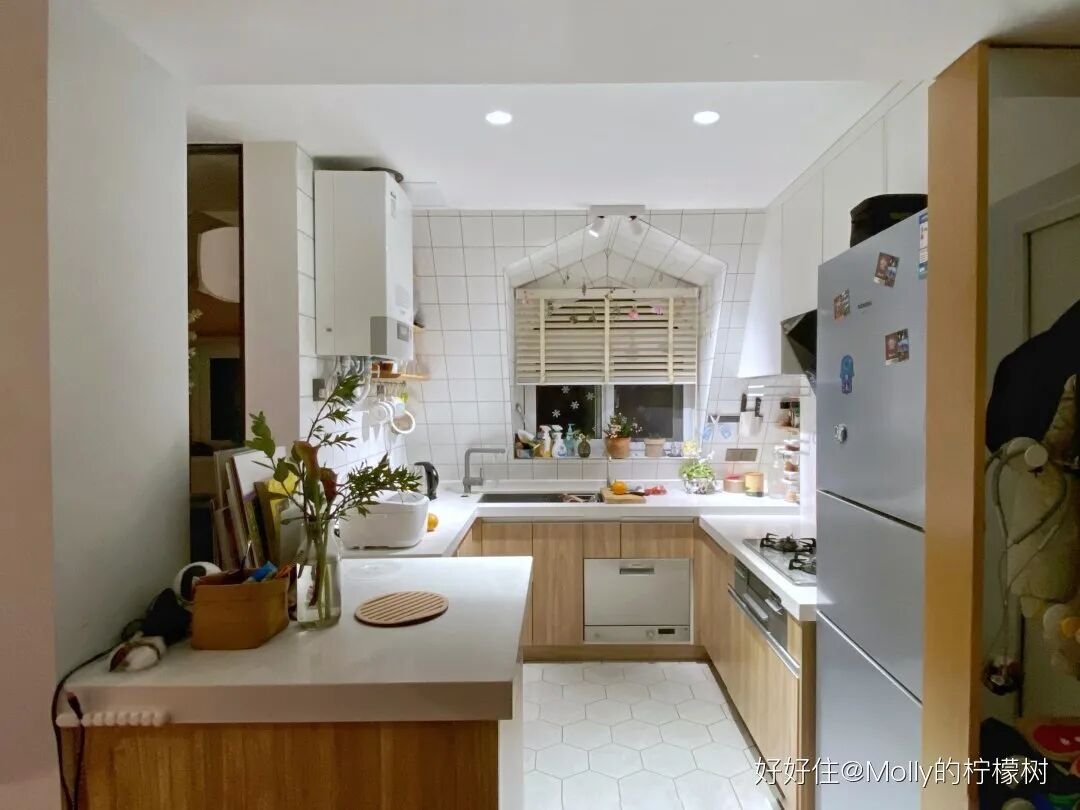 首先,它是开放式的,Molly 利用承重柱做了一个迷你中岛,让厨房和客餐厅形成洄游动线。