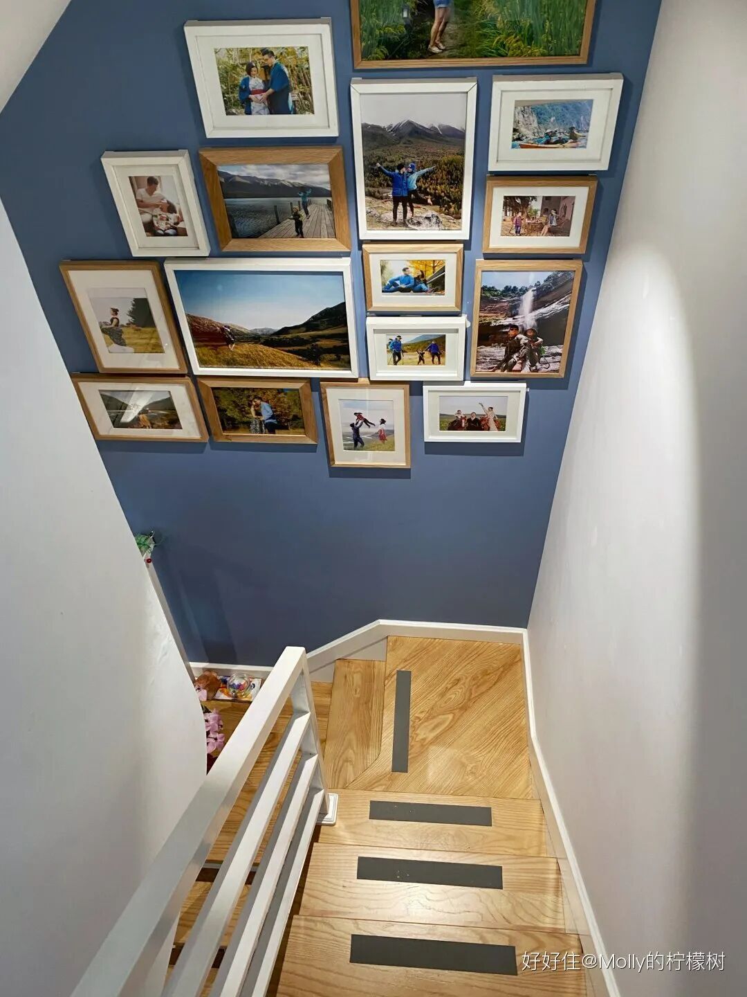 楼梯转角也不能闲着。Molly 设计了照片墙,把一家人各地旅行的照片都挂在墙上。为了小朋友上下楼梯更安全,还在地面特意贴上 3M 防滑条。