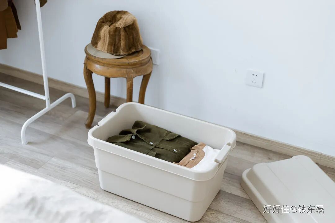 春夏的衣物,他基本只是收纳在盒子里。外套就挂在架子上。