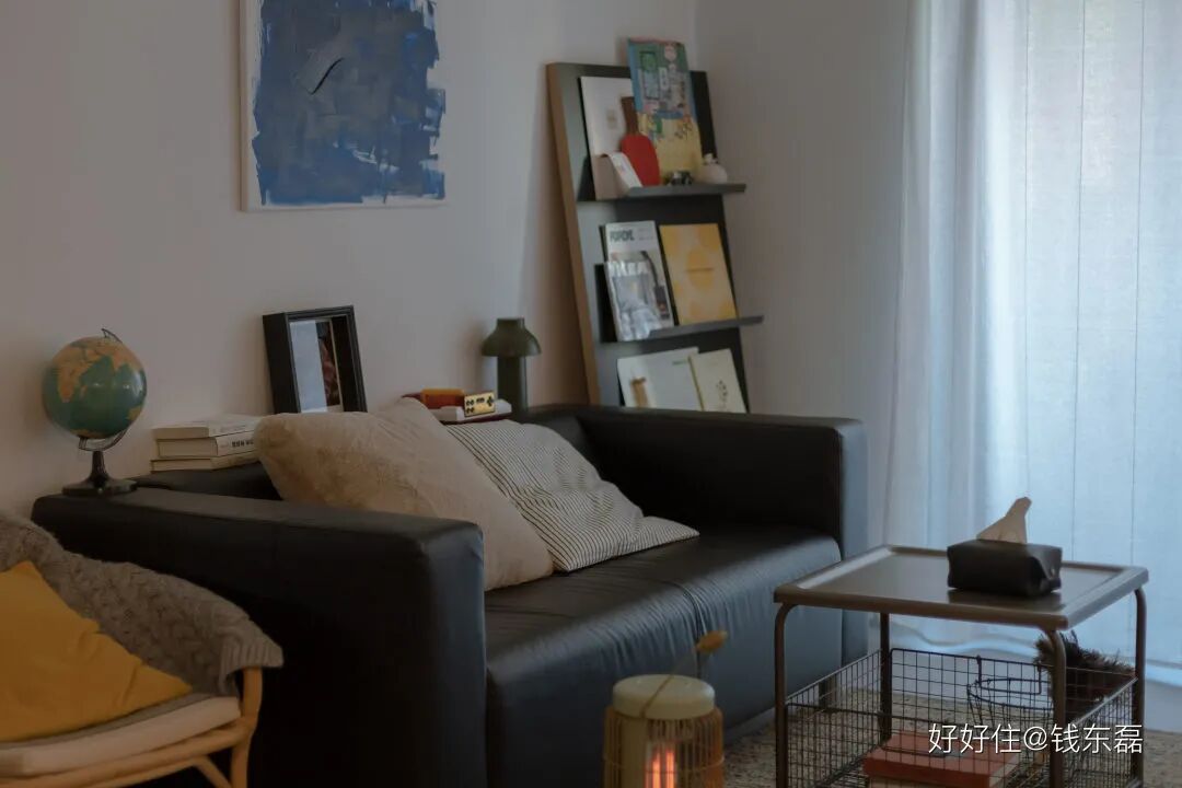 茶几是一款停产的铁皮小推车,底部也有储物空间,东磊相当满意。