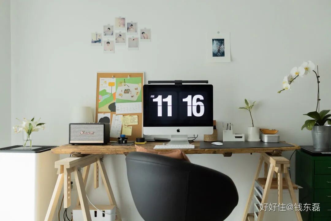 办公桌是用老榆木门板+宜家桌腿的方案,榆木门板是从上一个房子里带过来的,用了四五年,门板都开始包浆,但是他已经习惯这种桌面触感。