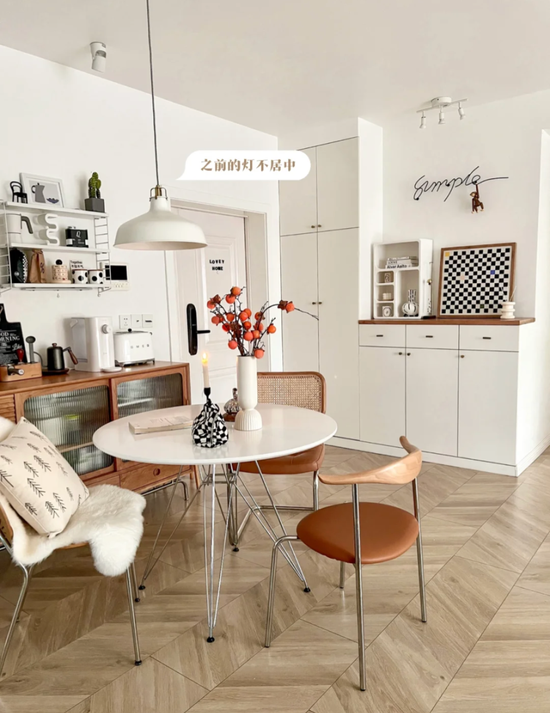 住友@小楠瓜Q_Q 为了加餐边柜,挪了挪餐桌,结果吊灯就不居中了,每天看着太难受。