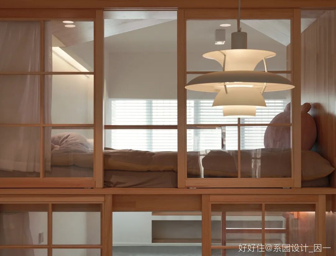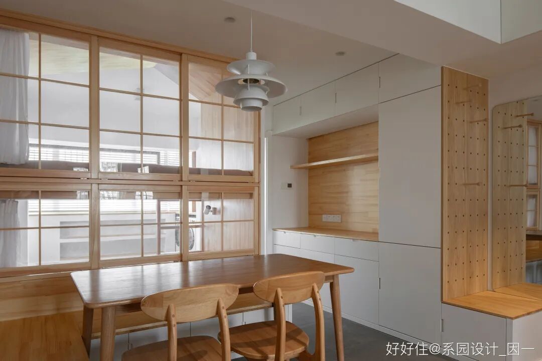 引「窗」入室,用六扇推拉窗来处理餐厅与儿童房的边界,从而解决采光性与私密性之间的矛盾。设计师巧妙用建筑设计的方法,来解决室内设计的问题。