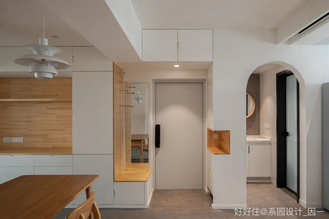 入户门隐在玄关柜之后,颜色与柜门统一。卫生间实现干湿分离,长虹玻璃门也退至湿区,干区只留一扇空的拱门。「门」的后退,形成微小的尺度空间,让空间有了延伸感。