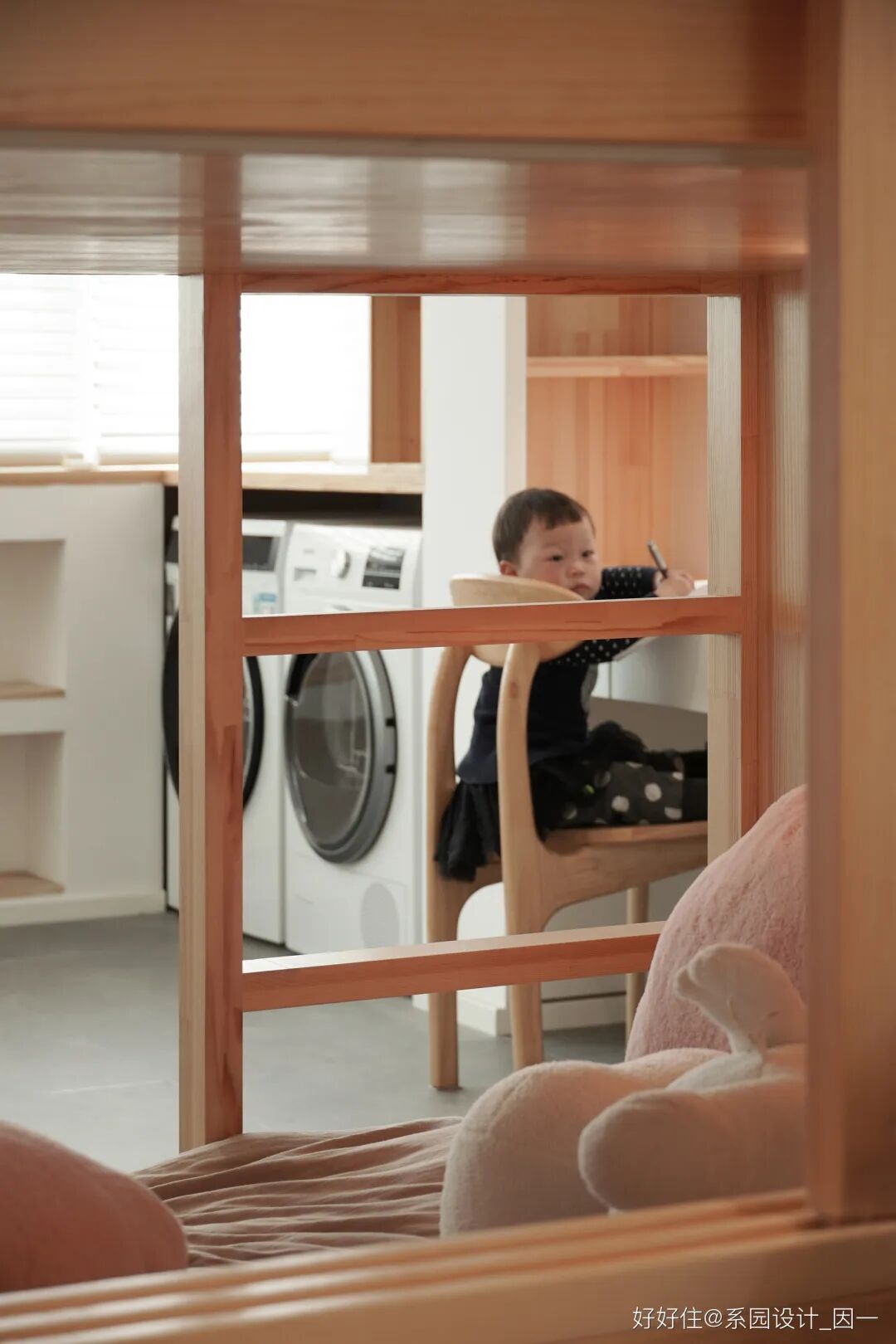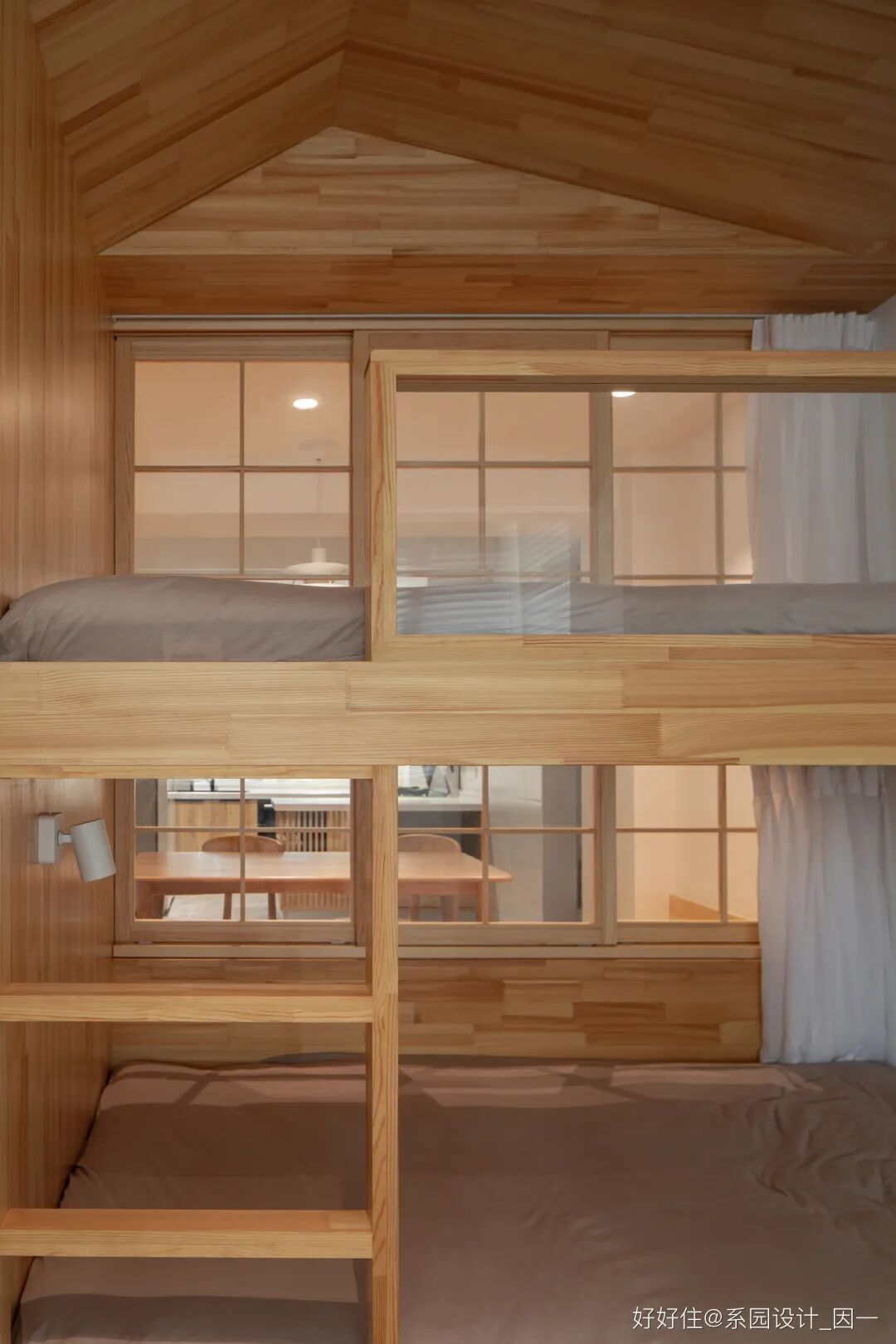因为家中有两个女儿,儿童房做了高低床,与餐厅卡座是一个整体,中间用六扇窗户分隔,成为家里最大的一件家具。