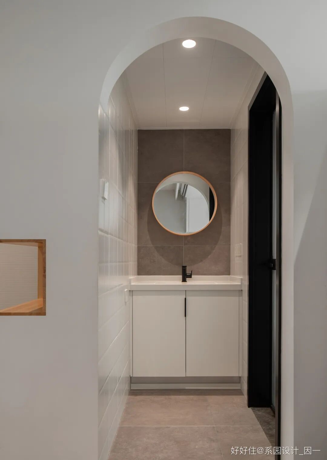 卫生间实现了干湿分离,拱门和圆镜搭配,形成一组景致。