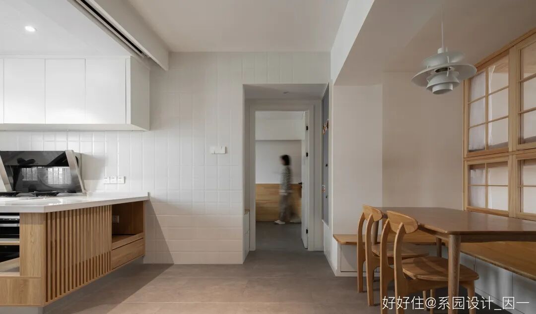 ①引「窗」入室:将厨房南侧的隔墙拆除,增设岛台,与客餐厅融为一体。餐厅与南侧儿童房,存在采光性与私密性的矛盾。设计引入「窗」,用六扇推拉窗,解决矛盾,做到南北通透。