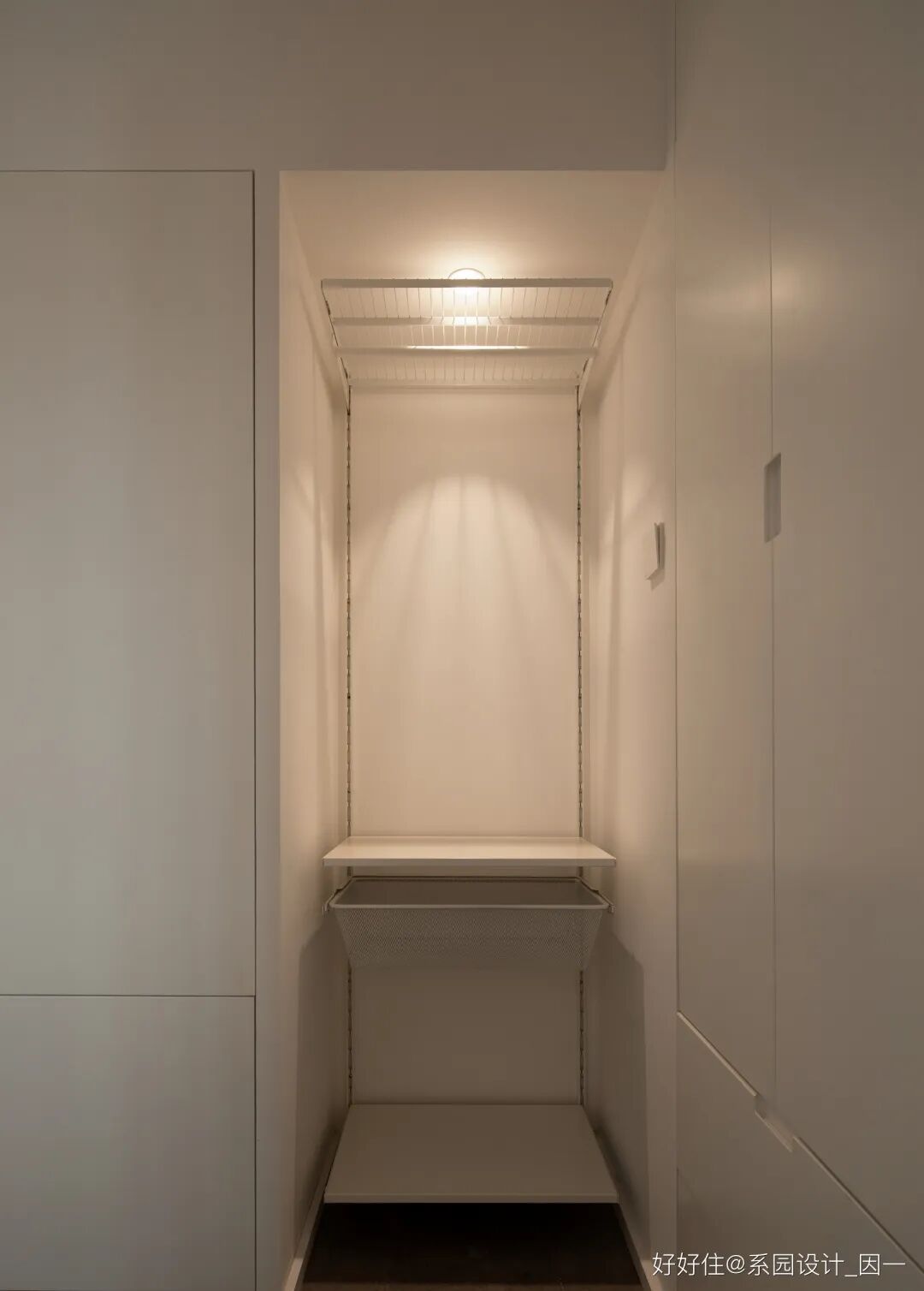 西侧衣柜区,留出一格放置宜家博阿克塞收纳系统,作为次净衣区使用,可以随着日常生活的需要,灵活增减配件。