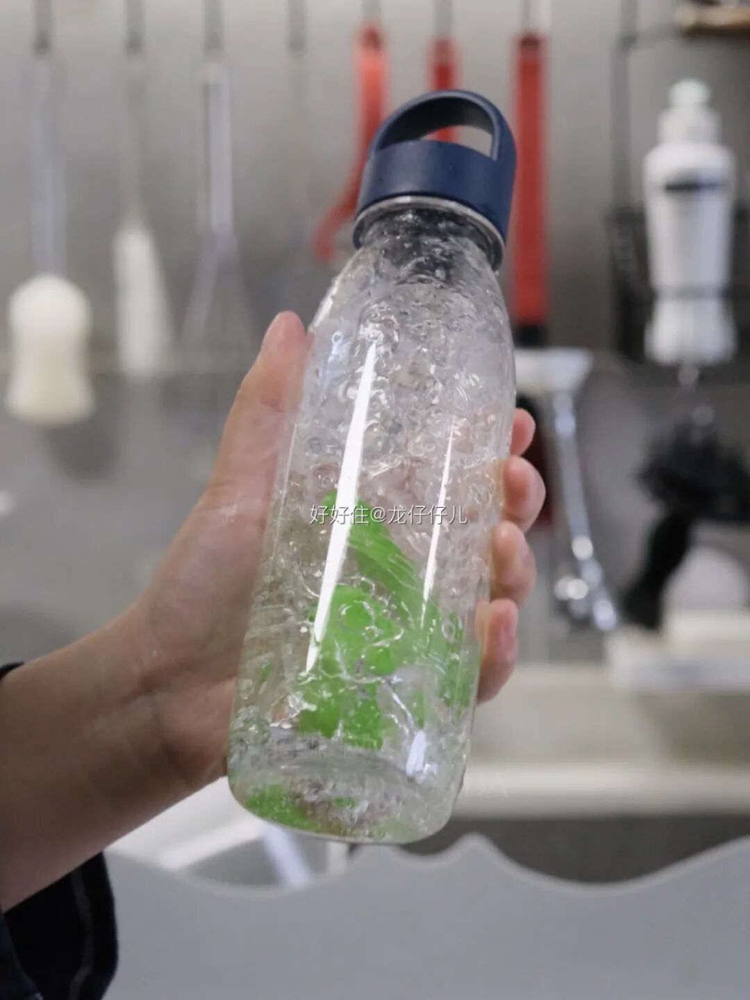 住友@龙仔仔儿 就丢了两颗「毛豆」进去,瓶中加入水和清洁剂,使劲晃晃,本身带点自重的毛豆能够带走内壁污垢,洗瓶子的过程也变得有趣。