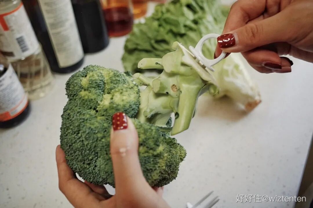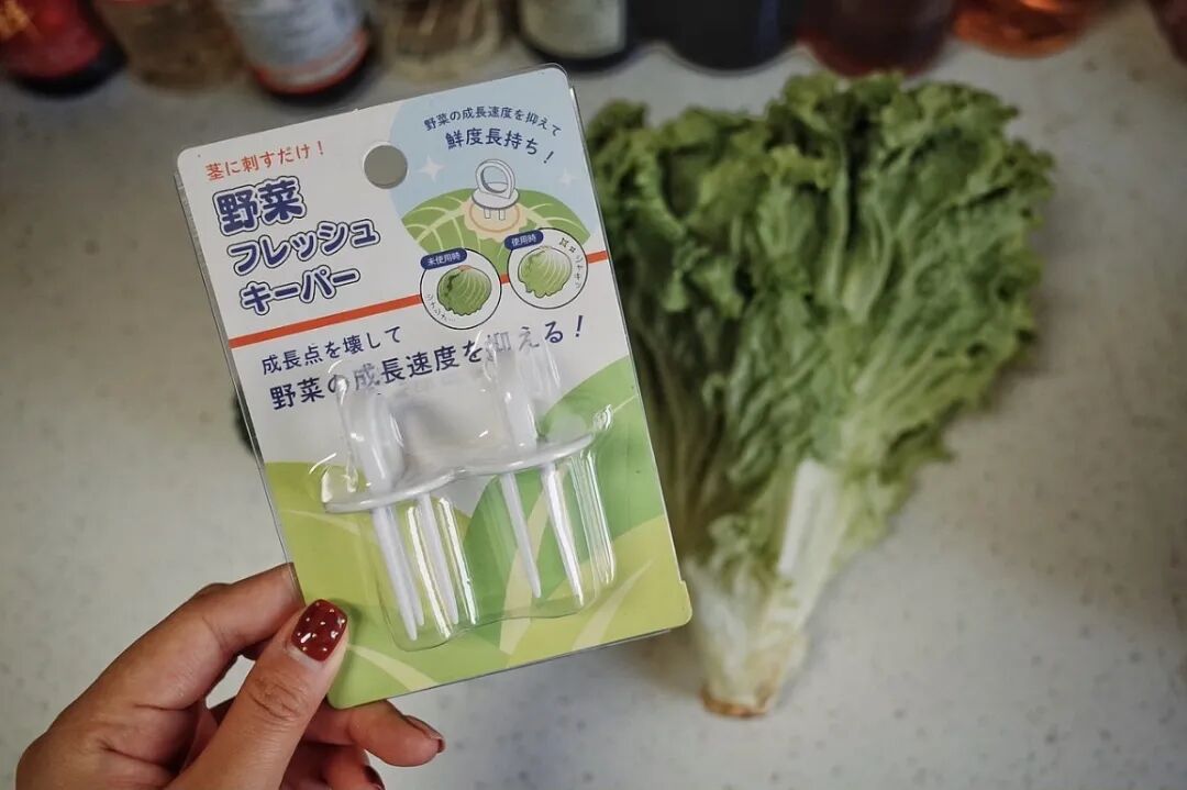 这个原理大概属于「点穴大法」,把西兰花、圆白菜、生菜等蔬菜的根部戳破,封印它的生长点,阻断内部营养流通,就能有效减缓生长和变化的速度了。