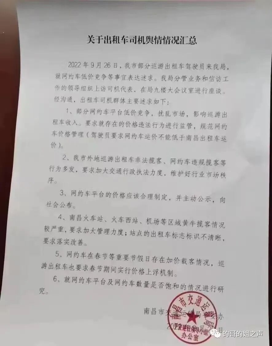 南昌的哥的姐在交通局的上访维权进行了几个小时,南昌交通局相关领导出面进行了接待,出租车司机们递交了自己的维权诉求书。之后交通局领导和出租车维权代表一起,在交通局九楼会议室召开了一个座谈会。后经交通局相关领导总结梳理,南昌出租车司机一共提出了如下六个问题: