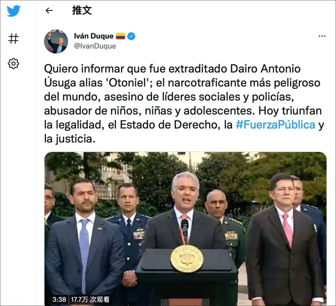进一步检索可见,5月5日,哥伦比亚警方的官方Facebook账号发布了此视频,并附文:“将化名为奥托涅尔(Otoniel)的人引渡到美国,是哥伦比亚在打击有组织犯罪和贩毒方面的一个历史性里程碑。这是一个明确的信息:不会有有罪不罚现象,我们将为受害者及其家人伸张正义!”