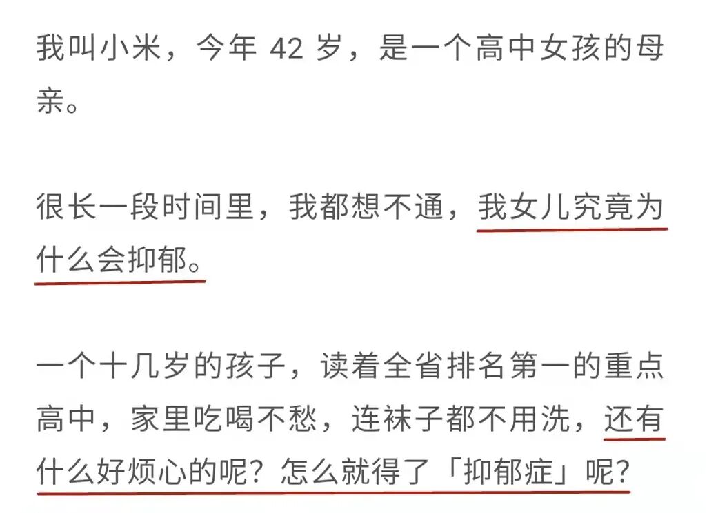 有一位母亲,在发现14岁的孩子得了抑郁症后,很震惊,她为了了解孩子为什么会变成这样,加入了一个互助群。她发现群里的500 名家长每天都在控诉孩子的“不正常”:不做作业、不出门、不说话、没食欲、不运动、沉迷游戏……