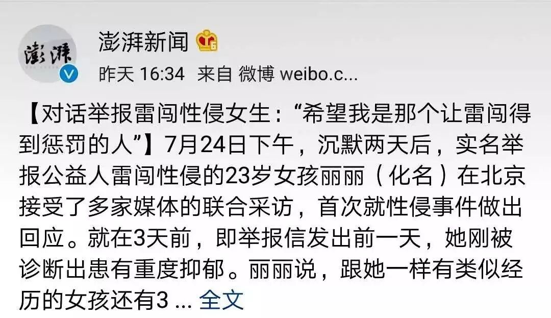 7月22日,23岁的姑娘丽丽(化名)发长文举报,3年前,在参加徒步公益活动时,被“乙肝斗士”、亿友公益发起人雷闯性侵。