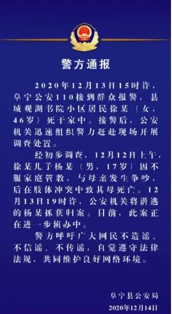 12月12日上午,是个周六,因为学业问题,母子二人发生争吵,后引发肢体冲突。