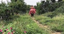 摘下的蜜桃放入推车后用布裹住,防止圆滚的桃受到颠簸滚出,再由大叔一筐一筐的推下山。