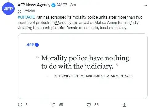 在两个多月的抗议活动后,伊朗取消了道德警察部队。总检察长穆罕默德·贾法尔·蒙塔泽里说,“道德警察与司法机构无关”,并已被废除。