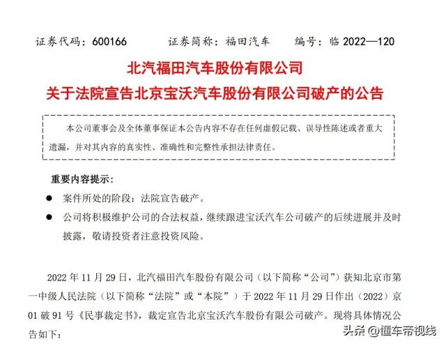 11月29日,北汽福田汽车股份有限公司发布关于法院宣告北京宝沃汽车股份有限公司破产的公告。