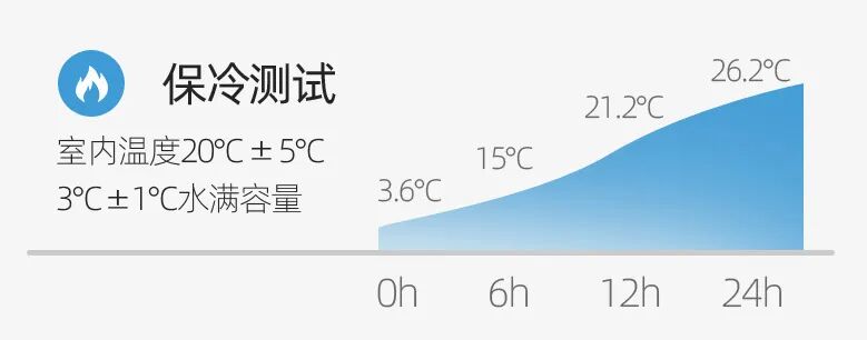 保冷效果也很出众,24小时才能从3.6℃增加到26.2℃,夏天装冷饮很方便!