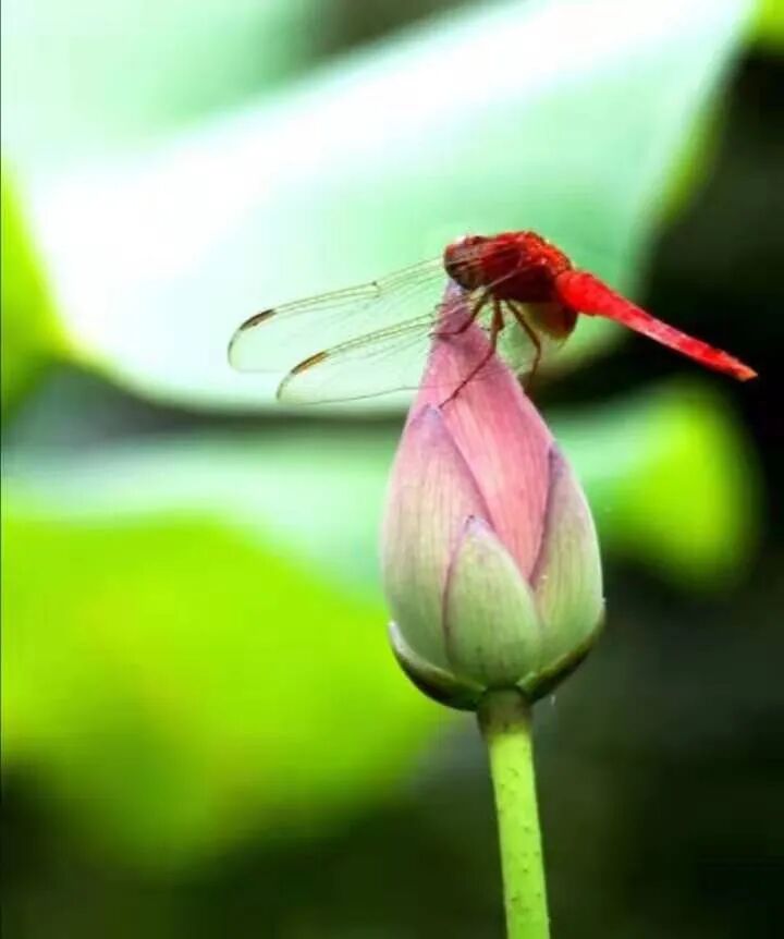 ①收诗友发来红蜻蜓佇立荷苞顶上,应嘱题图。