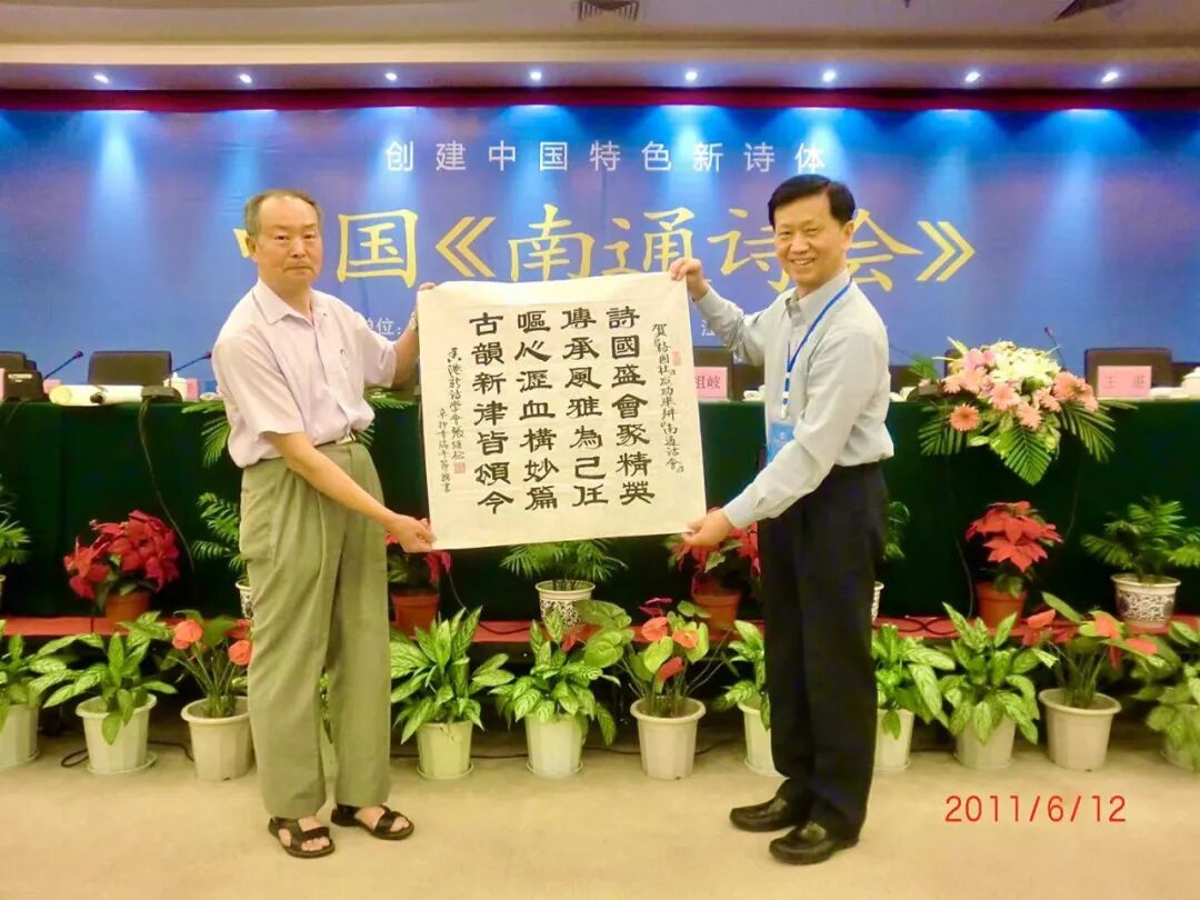 向诗会赠送自己撰书的贺诗,与诗会主席周国成老师合照