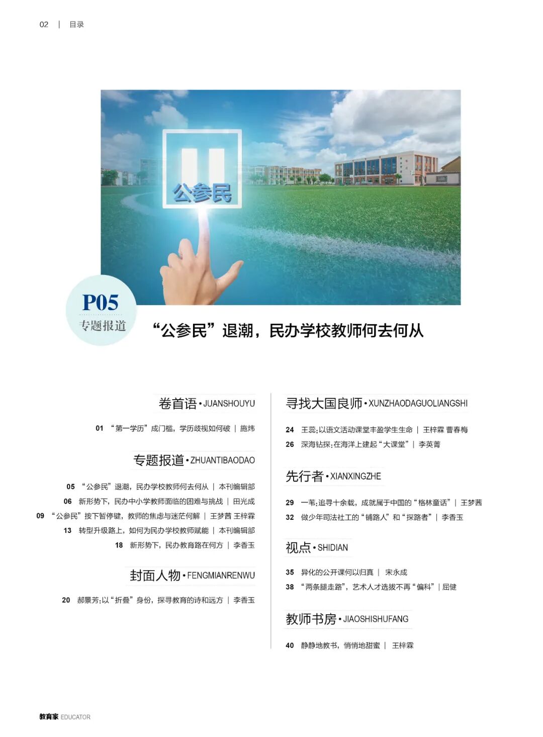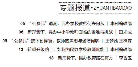规范“公参民”,旨在强化义务教育的公益性、公平性和人民性,进而构建公办学校与民办学校各安其位、相互促进的教育格局,建设公平而优质、均衡而多样、全面而有特色的高质量义务教育体系,但转型期的阵痛也难以避免。本期专题报道聚焦在民办教育转型升级的背景下、在全面规范“公参民”学校的过程中,民办学校教师面临着哪些问题与挑战,如何保障民办学校教师的合法权益,支持和规范民办教师队伍建设,怎样有效解决困扰民办学校教师的流动性大、归属感低、福利待遇差等问题,以期为民办学校教师赋能。